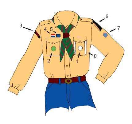 (6 & 8) Bij de scouts dragen ze verder nog schouderlinten(6) en balkjes op het linkerborstzakje(8) om je rang in de groep aan te geven. één balk staat voor assisten patrouilleleider en twee voor patrouille leider.
